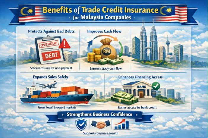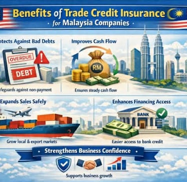 Trade credit insurance protects businesses against the risk of customers failing to pay their invoices. In Malaysia, many companies offer credit terms of 30 to 90 days, which exposes them to the risk of bad debts.
